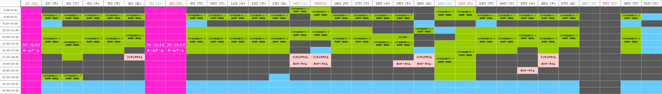2月の一般滑走スケジュールをご案内いたします。スケジュールは添付画像をご確認ください。※予定は変更になる場合がございますので、最新の情報をお確かめください。【八戸市多目的アリーナ条例枠】赤…